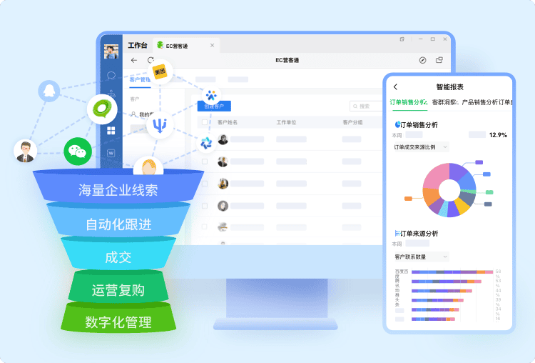 解决广告效果差、客户难成交、业绩不可控、复购率低等销售拓客难题,打通企微/个微进行社交化客户管理,连接公域和私域,实现一站汇集商机-一键高效触达-智能加速成交-服务和复购,持续转化客户。